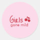 Diese Party-Favor-Sticker zeigen das spielerische und stilvolle Girls-Gone-Mild-Design, perfekt für moderne Junggesellinnenabschiede und Wochenendfeiern unter Mädchen. Das Design zeigt den Ausdruck "Girls Gone Mild" in fetter, kirschroter Schrift, gepaart mit süßen Kirschen-Illustrationen und vor einem weichen, rosafarbenen Hintergrund für einen fröhlichen, flirtenden und femininen Look.