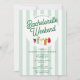 Ein buntes, handgezeichnetes Wasserfarben-Cocktails-Design mit verschiedenen Arten von alkoholischen Getränken. Ein schönes Design, perfekt für Junggesellinnen-Abschiedspartys. Diese Einladung zum Junggesellinnen-Abschied enthält auf der Rückseite einen Wochenend-Itinerary. Eine retro-moderne, vintage-grüne und weiße gestreifte Einladung zum Junggesellinnen-Wochenende.