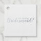 "Wirst du meine Bridesmaid sein?" Elegante Silver Foil Fvor Tags mit dem Titel "Will You Be My Bridesmaid?" in echter silberfarbener Silber-Folie moderner Script-Schriftart-Stil auf der Vorderseite mit grauem, individuellem Text auf der Rückseite.