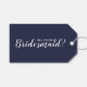 "Wirst du meine Bridesmaid sein?" Moderne Schrift Navy Blue Geschenketiketts mit der Formulierung "Will You Be My Bridesmaid?" in weißem, modernem Script-Schriftart-Stil mit Details in weißen modernen Sans Serif Schriftart auf marineblau Hintergrund.