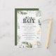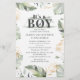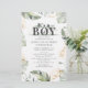 Wilde, ruhige und elegante Jungs Safari Baby Dusche Einladung mit einer Giraffe, Goldeffekt und grünen Blätter. Ideal für Jungen mit Baby-Dusche.