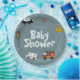 Diese niedlichen und modernen Jungs Baby-Duschpapier-Teller verfügen über eine blaue Cartoon-Transportabbild mit einem Krankenwagen, einem Polizeiwagen und einem Motor-Feuerwehrauto. Es gibt auch Platz für Sie, um den Namen der Mütter hinzuzufügen.