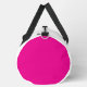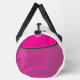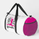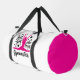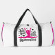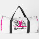 This white duffle bag features a pink silhouette of a gymnast in a split leap, surrounded by hearts and the text "Just a Girl who loves Gymnastics." This design is perfect for young gymnasts and fans of the sport. Edit color of the bag caps and body in the Design tool to your favored colors.