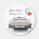 Weißer Oldtimer, verziert mit Blume und Ballons, Text "Just Married". Denken Sie daran, Text anzupassen