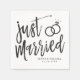 Ein lustiges und einzigartiges Drehbuch mit einer Serviette, speziell auf Sie zugeschnitten, ein post-nuptial Party. Es enthält die Worte "Just Married" mit den Eheringen, die darüber liegen. Unter diesem und darüber sind die Namen der Braut und des Bräutigams und der Hochzeitstag.