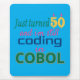 This vibrant tech-themed graphic proudly states, "Just turned 50 and I’m still coding in COBOL", making it a perfect nod to veteran programmers and mainframe developers. Ideal for software engineers, IT veterans, and coding enthusiasts, it celebrates the timeless relevance of COBOL in the programming world with a bold, humorous design.