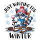 A charming raccoon sits comfortably in a rocking chair, wearing a cozy red hat and a blue scarf, holding a glass of wine. Snowflakes gently fall around, creating a winter wonderland atmosphere. The scene transitions with a smooth zoom-in on the raccoon, highlighting its cheerful expression. The background features pinecones and a soft, snowy landscape, enhancing the cozy vibe. The text 'JUST WAITING FOR WINTER' arches above in a playful font, complementing the whimsical style.