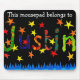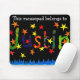 Ein hochwertiges Mousepad mit einem farbenfrohen handbemalten Papier Collage Design Sprichwort "Dieses Mousepad gehört zu Justin" auf einem schwarzen Hintergrund. Siehe auch passende Grußkarte und Geschenke.