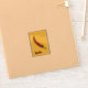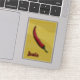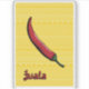 Ein roter Jwala-Chili-Pfeffer, auch bekannt als indischer Hot-finger-Pfeffer, ist mit von indischer Technik inspirierten Mustern geschmückt und sitzt auf einem gelben Hintergrund mit einer kleineren Version desselben Musters und einem Schriftzeichen in der Ecke. Dieser leicht gewürzte Pfeffer wird verwendet, um authentische Curries und andere indische Gerichte zu wärmen.