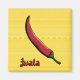 Ein roter Jwala-Chili-Pfeffer, auch bekannt als indischer Hot-finger-Pfeffer, ist mit von indischer Technik inspirierten Mustern geschmückt und sitzt auf einem gelben Hintergrund mit einer kleineren Version desselben Musters und einem Schriftzeichen in der Ecke. Dieser leicht gewürzte Pfeffer wird verwendet, um authentische Curries und andere indische Gerichte zu wärmen.