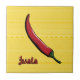 Ein roter Jwala-Chili-Pfeffer, auch bekannt als indischer Hot-finger-Pfeffer, ist mit von indischer Technik inspirierten Mustern geschmückt und sitzt auf einem gelben Hintergrund mit einer kleineren Version desselben Musters und einem Schriftzeichen in der Ecke. Dieser leicht gewürzte Pfeffer wird verwendet, um authentische Curries und andere indische Gerichte zu wärmen.