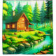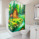 Dieser Duschvorhang hat eine Hütte im Wald darauf.