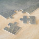 Puzzle einer Landschaft mit einer hölzernen Kabine am Ufer von See Bohinj mit Reflexion des Waldes mit Bäumen in den Herbstfarben im ruhigen Wasser des Sees nah an geblutet in Slowenien.