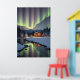 Eine gemütliche Holzhütte mit warmen, leuchtenden Fenstern befindet sich auf einer schneebedeckten Bank mit Blick auf einen verwinkelten Fluss. Der Himmel über dem Himmel ist von lebhaften grünen und lila Farbtönen des Polarlichts geprägt und strahlt ein magisches Licht auf die umliegende Landschaft aus. Die schneebedeckten Bäume und Berge in der Ferne tragen zur ruhigen und malerischen Szene bei.
