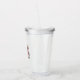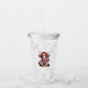 Eine süße Cartoon-Kuh sitzt und schlürft einen eisgekühlten Kaffee durch einen Strohhalm. Sie hat braune und weiße Flecken, einen rosa Schal und braune Stiefel. Auf ihrem Kopf sitzt eine rote Mütze mit den Worten „Coffee Addict“ (Kaffe Junkie).