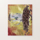 Kaffeetasse in einem Stapel des aromatischen Bohnen-Sets gegen eine strukturierte abstrakte Pastellmalerei
