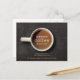 Ein Foto einer Kaffeetasse auf schwarzem Holzkorn hält Ihren Firmennamen in einer stilisierten Textbearbeitung auf dieser beruflichen Postkartenvorlage. Bitte wenden Sie sich an den Designer, wenn Sie Hilfe bei längeren Namen oder alternativen Textlayouts benötigen. Dieses Design ist Teil einer Reihe kongruenter Geschäftssicherheiten. © 1201AM CREATIVE