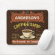 Dieses Kaffee-themenorientierte mousepad ist für jedermann perfekt, das ihr eigenes Kaffeegeschäft laufen lässt oder ein Kaffeethema in ihrem Zuhauseküchendekor hat. Getan in retro Braunem, orange, beige und gelb, inspirierten dieser Espresso/Cappuccino Ausrüstungsbeschreibungen ein Schale auf einem Saucer, zwei personalisierten Textfahnen und den Wörtern "Kaffee-Geschäft/frischer Braten/großes Aroma" im Gelb.