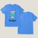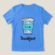 T-Shirt in einer stilisierten Kaffeetasse mit blauen Blumenmustern. Eine hellblaue Hülle mit der Bezeichnung "le Café" umschließt die Tasse. Darunter steht das Wort "Frühstück" in einem spielerischen, handgeschriebenen schwarzen Schriftart, der an ein Café-Ambiente erinnert.