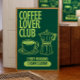 Starten Sie Ihren Tag mit kühlen Lieben und Coffein - dieses Poster des Coffee Lover Club ist ein Muss für jeden, der die heilige Morgenbraue verehrt. Mit einem Vintagen Chalkboard-ästhetischen, lebendigen neongrünen Text und charmanten, handgezeichnet Illustrationen eines Dampfbechers und einer Moka-Kanne verbindet dieses Kunstwerk Retro-Flair mit moderner Kaffeekultur. Ob Sie im Morgengrauen Solo schlürfen oder Ihren eigenen gemütlichen "Club" von Kaffeeskranken beherbergen, dieser Druck bringt Persönlichkeit und Punsch in Ihre Küche, Ihren Studentenwohnheim, das Café Nokia oder das Zuhause Office. Die lustige Typografie und der fette Kontrast machen es zu einem Statement-Element, das Ihren Raum ebenso wie den Espresso selbst belebt. Ideal für Baristas, Café-Besitzer, Studenten oder alle, die ihr Morgenritual feiern, ist dieses Design auch ein humorvolles und herzliches Geschenk für Kaffeeliebhaber, Mitbewohner oder Mitarbeiter. Es eignet sich hervorragend für die Dekoration von Pausenräumen, Frühstücksbars oder als ein unheimliches Begrüßungszeichen bei den morgendlichen Treffen. Erinnern Sie die Welt daran, dass Kaffee mehr ist als ein Getränk - es ist ein Lebensstil. Lassen Sie Ihren Brauenstolz mit dieser lebendigen Wandkunst aus und machen Sie Ihren Morgen etwas zauberhafter. Fügen Sie dies noch heute Ihrem Warenkorb hinzu und machen Sie jedes Schlückchen zum Teil Ihrer Unterschrift! Für diejenigen, die die Instant-Download-Version kaufen, schreiben Sie mir bitte, wenn Sie zusätzliche Größen möchten, um Ihre Bedürfnisse besser Anzug.