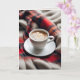 Eine Tasse Kaffee auf einer Untertasse mit Cremeherz-Design auf einer karierten rot-grauen Decke. Alle Texte können bearbeitet werden.