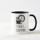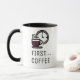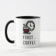 "First..Coffee" in schwarzem Schriftart unter einer Retro-Tasse Kaffeebild mit einer Uhr im Hintergrund geschrieben. Erhältlich in vielen Stilen und Farben, aber zuerst eine Vorschau, wenn Sie Designänderungen vornehmen, um sicher zu gehen, dass Sie es mögen.