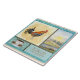 Eine schöne Kaffeekachel für einen Trivet, Wandaufhängung oder andere Zwecke. Original Art von Audrey Jeanne Roberts hat einen schönen handgemalten Aquarellhintergrund von cremig braun und aqua blau. Es gibt eine Grenze von schokoladenbraunen und blauen Karos, die vier Designs in einem Collage-Format teilen. Eines hat einen Hahn, das andere eine Wasserfarbe für Sonnenaufgänge, das dritte ist eine Kaffeetasse mit schokoladenbraunem, wirbelndem Design und das originelle Sprichwort von Audrey Jeanne Roberts: "Ohne Kaffee ist 'Guten Morgen' ein Oxymoron!"
