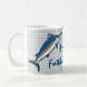 Nicht viele Fische sind unglaublich schön als das blaue Marlin — und nicht viele Fische sind größer. Das Blaue Marlin ist das größte der Atlantikmarline und, im Ernst, einer der größten Fische der Welt. Wie bei einigen Arten ist das Weibchen oft etwas größer als das Männchen. Weibchen können bis zu 4,5 m lang werden und mehr als 500 kg wiegen, obwohl der Durchschnitt mehr als 3,50 m lang und 150 kg schwer ist. Blau oben und silberweiß darunter, mit einer ausgeprägten Rückenflosse und einem langen, tödlichen, speerischen Oberkiefer (den einige als Schein bezeichnen), sind blaue Marline einer der am leichtesten identifizierbaren und erkennbaren Fische der Welt. Marlins sind bekannt für ihre unglaubliche Ausdauer in einem Kampf, wenn sie angezogen werden, was sie zu einem tropischen Favoriten von Großwildfischen macht. Obwohl man es auch von fast jedem supergroßen Fisch sagen kann, kann ich mir nicht vorstellen, dass es viel aufregender für den begeisterten Angler ist, als einen dieser Giganten zu hacken und zu sehen, wie er im Kampf Wasser bricht. Dieses Design ehrt diesen majestätischen Fisch mehr als die Angler, die ihn suchen. Für diese wunderbare Kaffee-Tasse rahmen zwei Marlins ein Textelement, "Happy Father's Day". Offensichtlich, eine ausgezeichnete Wahl für Vatertag, sind Sie willkommen, den Text zu ändern, um Ihre Feier für Ihren Lieblings-Angler besser Anzug.