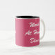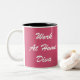 Zwei-getonte Kaffee- oder Tee-Tasse in rosa und Weiß mit dem Sprichwort "Arbeits-zu Hause Diva" für die Frau, die ein Leben an einem Job der Arbeit zu Hause als Freiberufler oder Anstellungfirma macht.