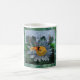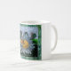Diese Kaffee-Tasse feiert Frühling mit einem Bild einer Biene und der Blume.