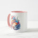Ein hübsches azurfarbenes Geburtstagskuchen mit rosa und blauen Blumen neben einer Tasse Kaffee oder Expresso.
