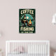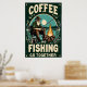 Eine Retro-Illustration mit einem Fischer, der am Lagerfeuer sitzt, mit einer Angelstange und einer Tasse Kaffee, wobei der Text Coffee & Fishing Go Together hervorgehoben dargestellt wird.