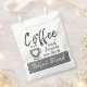 Weiße Geschenktütchen. Kaffee und Freunde sind die perfekte Mischung. Graue Lieben und eine Kaffeetasse.
