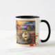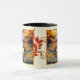 Tasse mit einem farbenfrohen Kunstgemälde von Hahn und Huhn mit einem Bauernhaus.