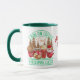 Hier ist eine niedliche Tasse für diese hektische Zeit kurz vor Weihnachten kommt! Ein Retro-Bild der festlichen roten Kaffeetassen, gefüllt mit der Braut, hat eine Waldbaumlinie als Hintergrund. Der grüne Text über und unter dem Bild sagt "Ich laufe auf Kaffee und Weihnachtsmann". Das Bild wird zweimal auf der Tasse gedruckt, mit "Frohe Weihnachten" und Ihrem Namen zwischen den Bildern.