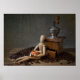 Stillleben mit alter Kaffeemaschine und geflochtener Puppe, die die Mühle bedient