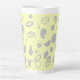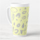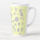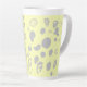 Diese Tasse zeigt auf einer gelblich weißen Oberfläche verschiedene Lavendelflecken und kreisförmige Linien, die Kaffeebohnen symbolisieren. Die Abbildung ist handgezeichnet.