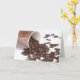 Tropfende Kaffeebohnen. Kaffeebohnen fielen in die Zeitung. Glas mit Kaffeebohnen fiel auf weißem Hintergrund.