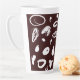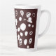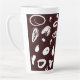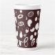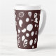 Diese Tasse zeigt auf einer dunkelbraunen Oberfläche verschiedene Formen mit weißen Flecken und kreisförmigen Linien, die Kaffeebohnen symbolisieren. Die Abbildung ist handgezeichnet.