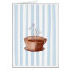 Illustration einer beruhigenden, dampfenden Tasse Kaffee-Set vor einem blau-weiß gestreiften Hintergrund. Ideal, um als Einladung zum Brunch, Kaffee oder einfach nur um mit koffeinliebenden Freunden zusammenzukommen! Entspricht auch den