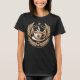 T - Shirt-Design mit einem Bild eines militärischen Insignien eines Kaffeekommandeurs, mit einer dampfenden Kaffeetasse mit verzierten Flügeln und Sternen, die ihn umgeben.