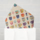 Eine Vielzahl farbenfroher Kaffee- und Teebecher mit unterschiedlichen Blumen- und Herzmustern sind in einem sich wiederholenden Muster auf weißem Hintergrund angeordnet. Jede Tasse präsentiert eine einzigartige Kombination von Farben und Designs und schafft so ein lebendiges und symmetrisches Display.