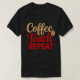 Dieses Bild zeigt einen schwarzen T - Shirt mit dem Wort "Kaffee", das in einem fließenden, bräunlichen Schriftzeichen oben geschrieben ist, begleitet von einer kleinen Abbildung der Kaffeebohnen. Unten steht das Wort "Teach" in einem größeren, roten Skript, und darunter ist "REPEAT" in fett gedruckten, roten, serifenlosen Hauptstädte.