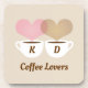 Ein niedliches personalisiertes Drink Untersetzer Design für "Coffee Lovers". Enthält zwei Kaffeetassen mit hellrosa und lattbraunem, herzförmigen Dampf und cremefarbenem Hintergrund. Personalisieren Sie den benutzerdefinierten Text mit den Initialen des Ehepaares.
