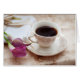 Cup gefüllt mit Kaffee sitzend auf einer Untertasse mit rosa Kala Lilien und Stoffservietten