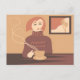 Illustration einer Dame, die an einem Tisch sitzt und eine heiße Tasse Kaffee oder Tee trinkt.