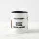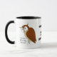 Eine weiße Tasse mit schwarzem Rand und Griff und eine schläfrige Eule vor und zurück, Sprichwort, "Ich bin kein Morgenmensch. Zwischen den beiden Eule, die Warnung lautet: Vorsicht, Behalt deine Distanz! Ideal für eine Nachtschüssel!