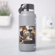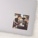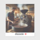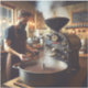 Ein nahes Händchen in einer abgetragenen Schürze, das eine Partie reichhaltiger, brauner Kaffeebohnen in eine Vintage Kaffeemaschine einfügt. Dampf oder Rauch steigt anmutig aus der Maschine und deutet auf den aromatischen Röstprozess im Inneren hin. Die industrielle und zugleich einladende Kulisse besticht durch eine rustikale Ziegelwand und eine warme Beleuchtung, die an ein gemütliches Café oder ein Bratwerk erinnert. Die mit Kaffee gefüllten Regale vervollständigen das authentische Café-Ambiente.