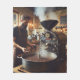 Ein nahes Händchen in einer abgetragenen Schürze, das eine Partie reichhaltiger, brauner Kaffeebohnen in eine Vintage Kaffeemaschine einfügt. Dampf oder Rauch steigt anmutig aus der Maschine und deutet auf den aromatischen Röstprozess im Inneren hin. Die industrielle und zugleich einladende Kulisse besticht durch eine rustikale Ziegelwand und eine warme Beleuchtung, die an ein gemütliches Café oder ein Bratwerk erinnert. Die mit Kaffee gefüllten Regale vervollständigen das authentische Café-Ambiente.