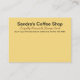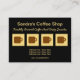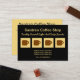 Kundengerechte Kaffeestube-Visitenkarten. Fügen Sie Ihre eigenen Details in Minuten hinzu. Bilder der Kaffeetassen. Hintergrund ist schwarz. Sie können Farbe des Hintergrundes ändern, wie Sie wünschen sowie die Art des Schriftartes. Zurück von diesem Kaffee-Geschäft kann Geschäfts-Karte benutzt werden, während eine Loyalität Karte vergütet, der Ihr Personal Platz setzen kann eine Briefmarke auf. Wenn dieses nicht angefordert wird, kann dieses aus der Karte einfach gelöscht werden.